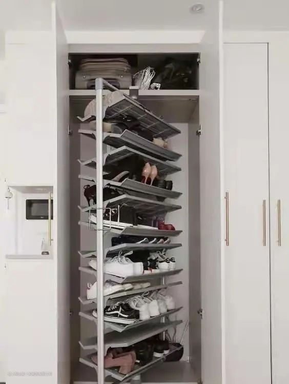 鞋柜也可以利用五金件,做成两面倾斜的旋转鞋架,呈Z字形排布的形式,让鞋帮和鞋面的高度差得到充分的利用,可以放两倍的鞋子。