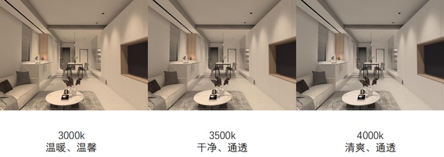 家庭常用的色温在2700K~4000K,一般常用的都3000-4000k,喜欢温馨暗调一点建议选3000k,纠结症可以考虑居中选3500k,喜欢清爽干净选4000k不会错。如下图所示,清楚看到三个色温呈现的效果。