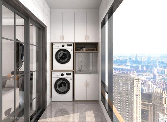 对于中户型阳台或是阳台面积较大的家庭,可以在洗衣区和储物区的设计基础上,增加一个洗漱区的位置。