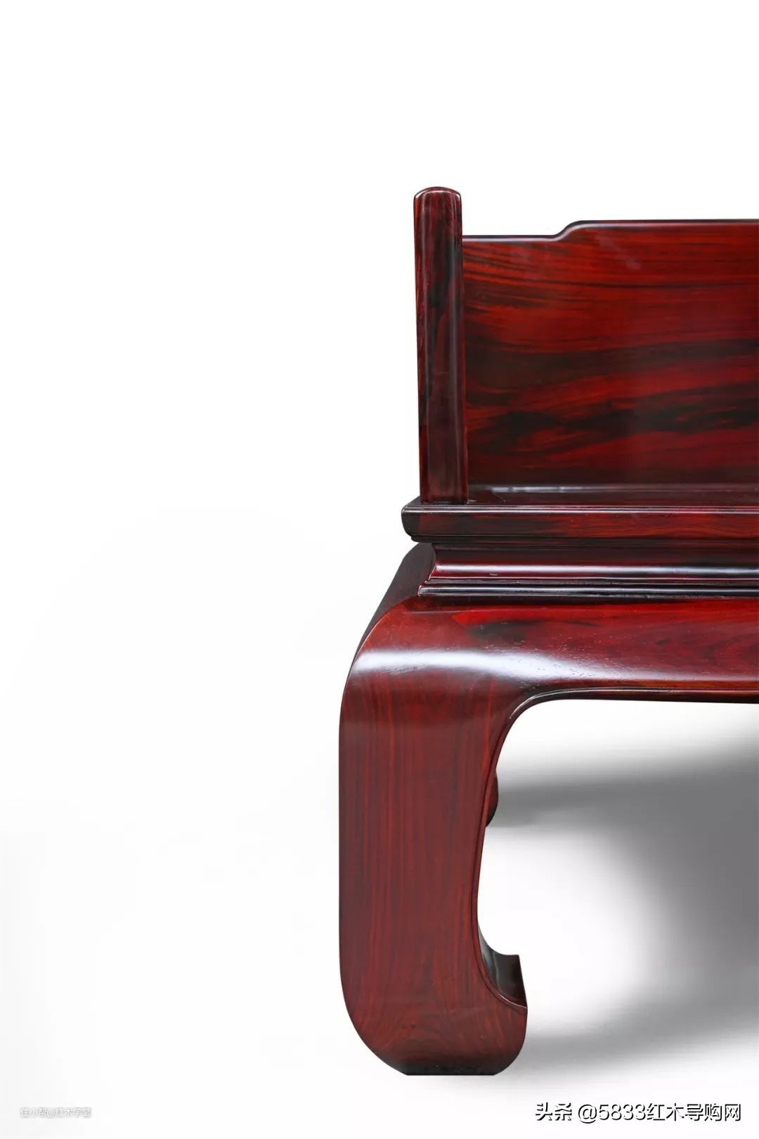 看完了几和桌案再来看看坐具,罗汉床其实应该属于一种坐具,虽然其名为床,但只是作为小憩使用的家具,真正的用处是用来待客之用,中置一小炕桌,隔开成两座,两人落座,闲谈、品茗、下棋亦可。此件罗汉床由大红酸枝制成,面上攒接三块床围,围子独板。其余各处不施雕工,纯以大红酸枝的天然纹理取胜,床面边沿冰盘沿,下接束腰,鼓腿彭牙,大挖内翻马蹄,椅盘下的腿足间以素直牙板。整器取材精美,用料厚重,不事雕琢的做法更使其拥有了一种“天然去雕饰”的纯净典雅之美感,较为难得。