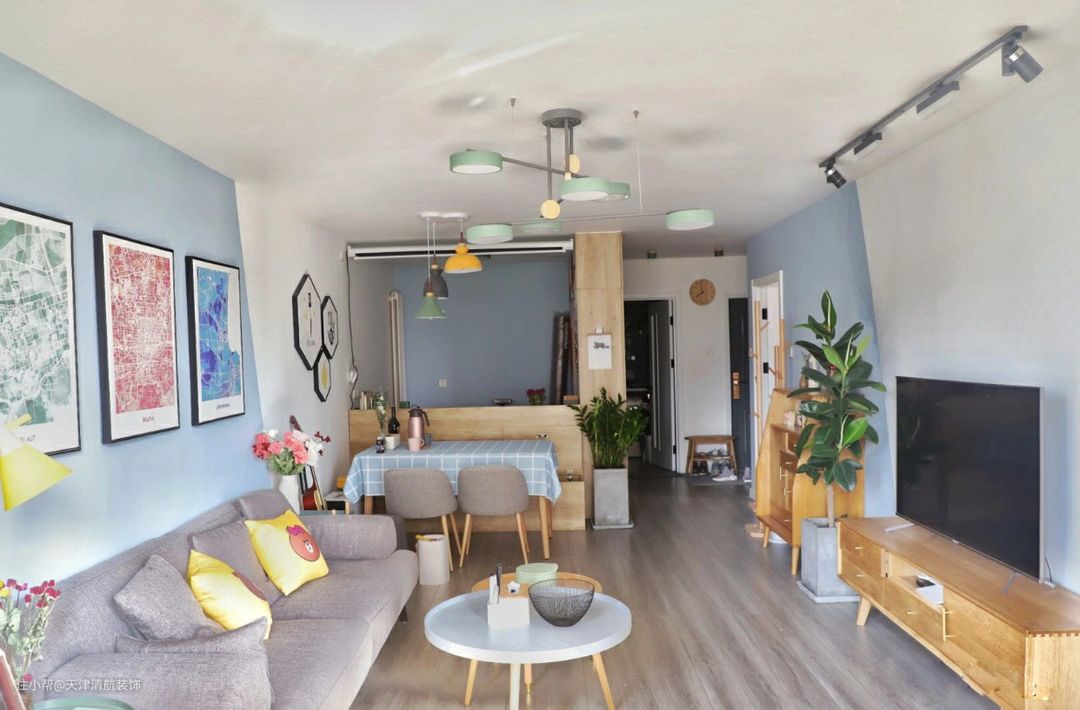 客厅电视墙是没有做任何造型,不过一半的墙体分蓝色与浅蓝灰色,色调是一样的,但是在明度上有点区别,显得没有那么单调。电视机直接放在原木色的电视柜上,左侧放着一个壁柜,加上植物做装饰,特别有生机,而且很实用。坐在沙发看看电视,太幸福了。