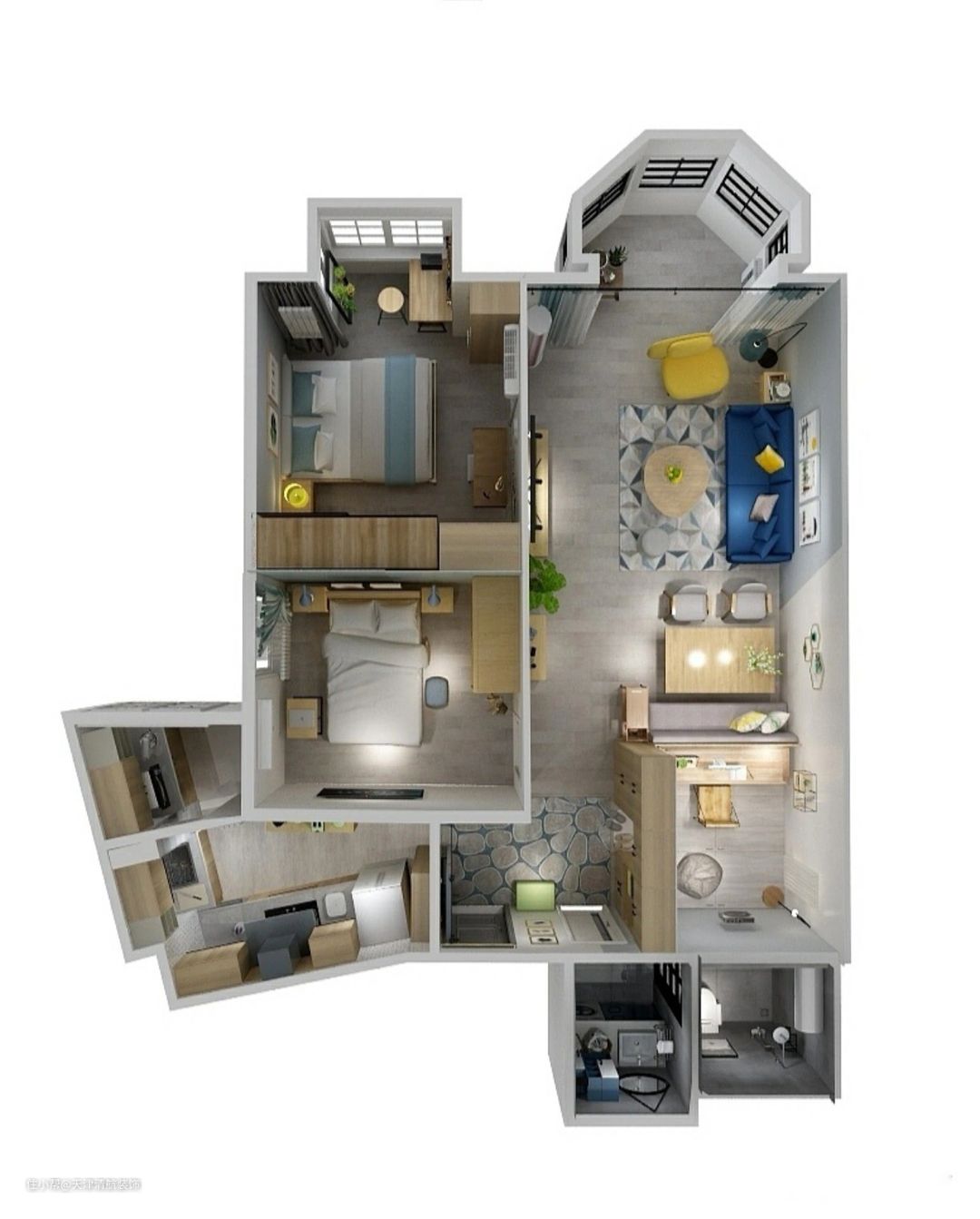 屋主自己画了一个3D立体图,可以看得更清楚,家里也是按这样的设计方案去装修与布局。说实在话的,每个空间都花了心思,最终慢慢变成想要的效果。