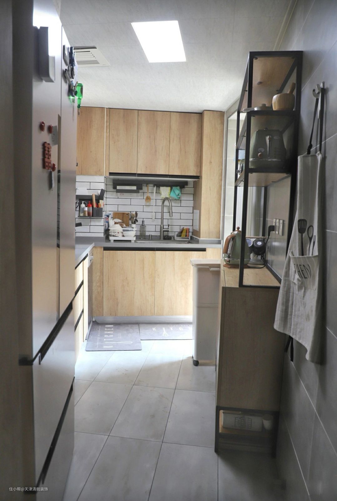 厨房根据结构定制原木色的橱柜,并且厨房外面的小阳台也利用起来。左侧可以放冰箱,右边还有一个架子,真心实用。