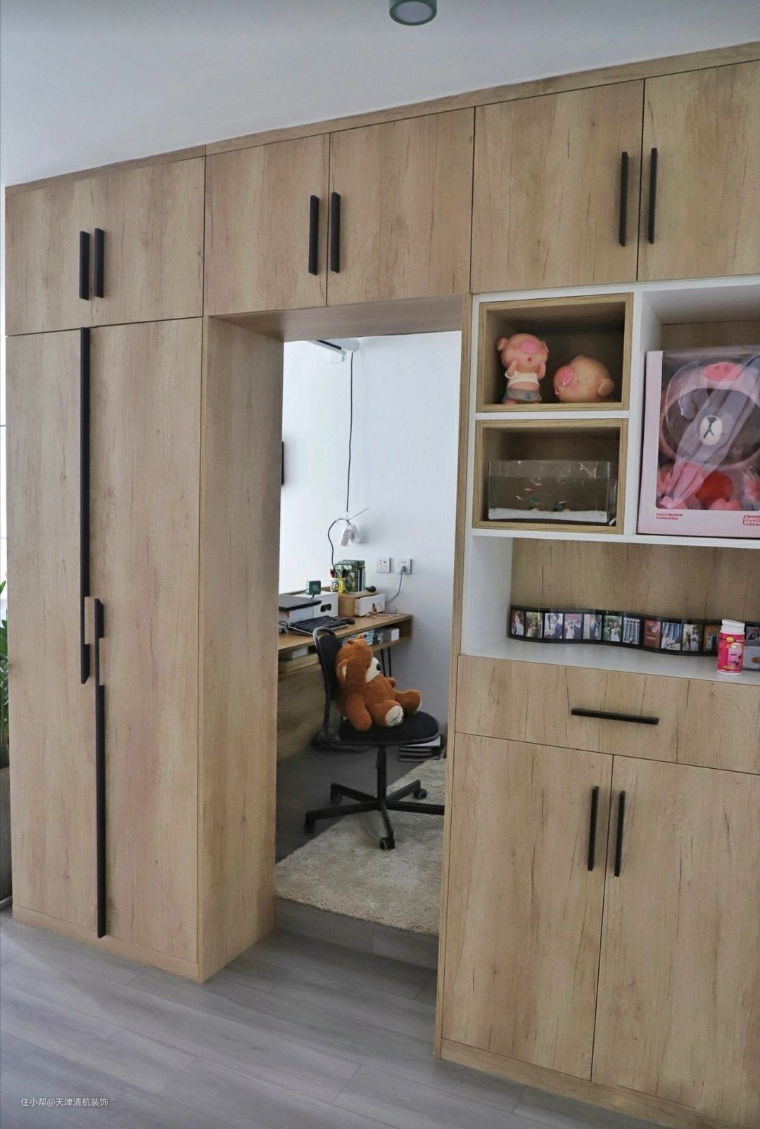 书房侧面不是用墙体做隔断,而是打了非常实用的储物柜,不管是收纳鞋子还是其他的杂物,储物空间都非常强大。选后面就是书房了,预留了一个门洞,进出都方便很多。屋主已经搬进来入住一段时间了,当初这样的设计堪称完美,柜子太实用了!