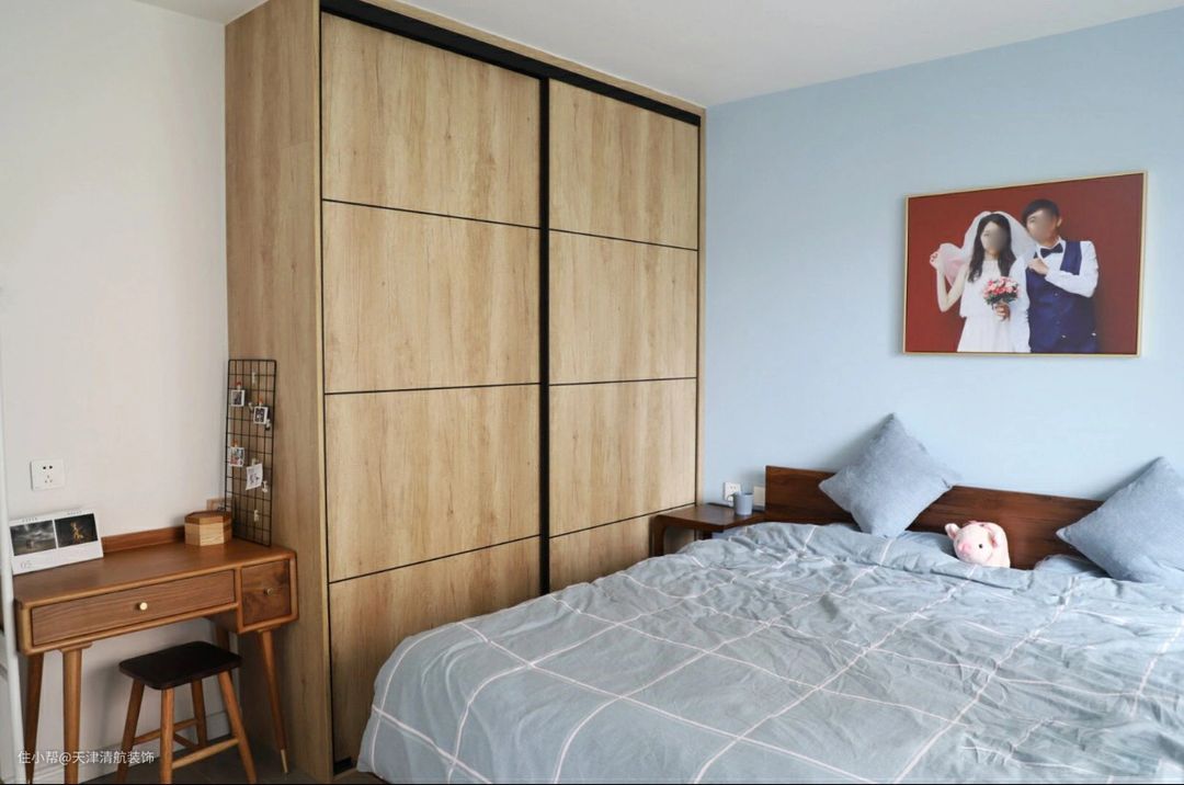 床头背景墙刷了蓝色乳胶漆,跟其他墙面形成区别,效果还是蛮不错的。布置了一张双人大床,左侧一个顶天立地的原木衣柜,储物空间足够了。床头墙上挂着他们夫妻拍的婚纱照,满满都是幸福的味道。