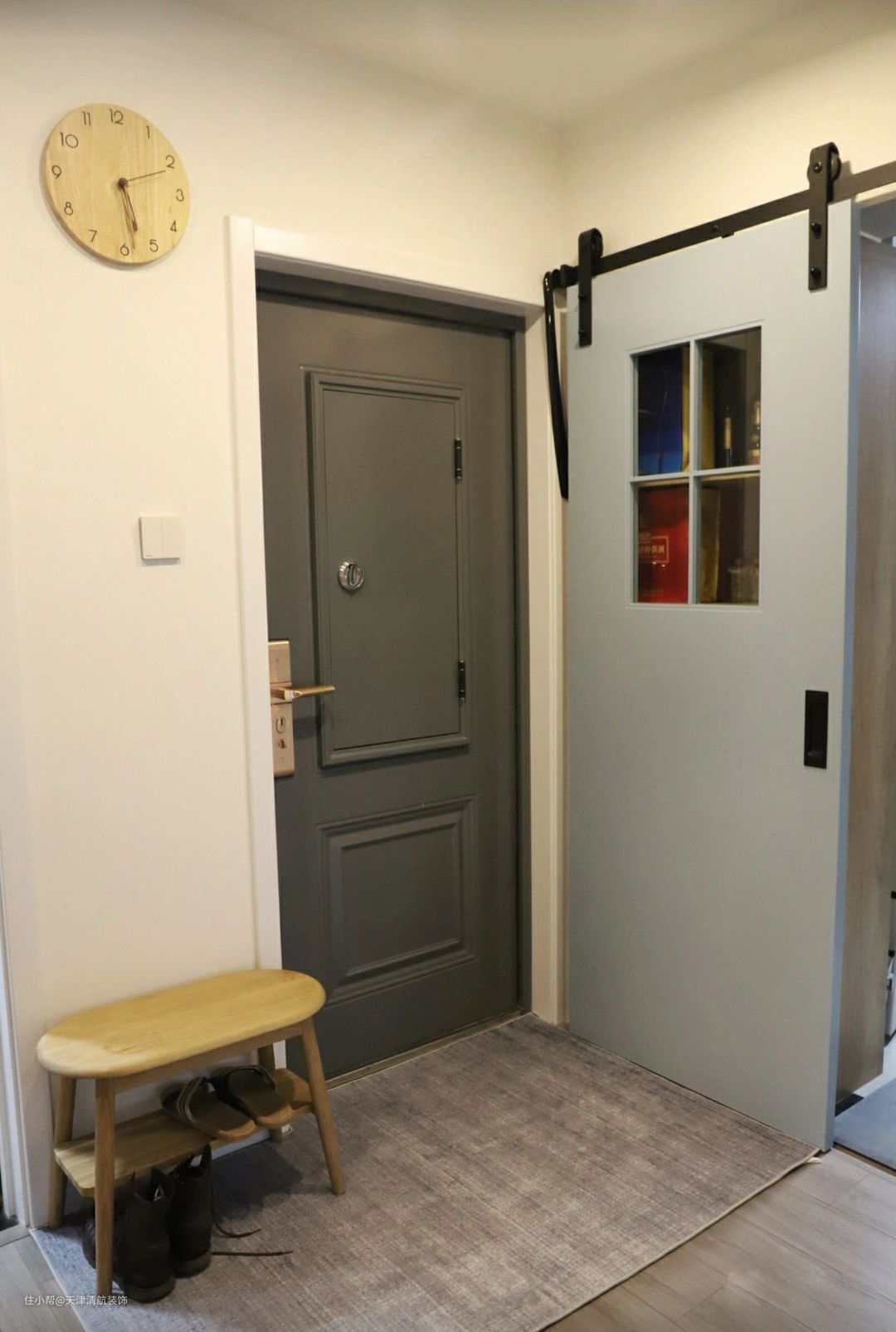 严格意义说户型是没有独立的玄关,所以利用旁边的厨房墙体打掉之后,设计了一个非常实用的鞋柜,可以满足大量的储物空间。厨房安装的灰色谷仓门,比较美观与个性,让人进来眼前一亮。旁边放着地毯,大小尺寸刚好合适。