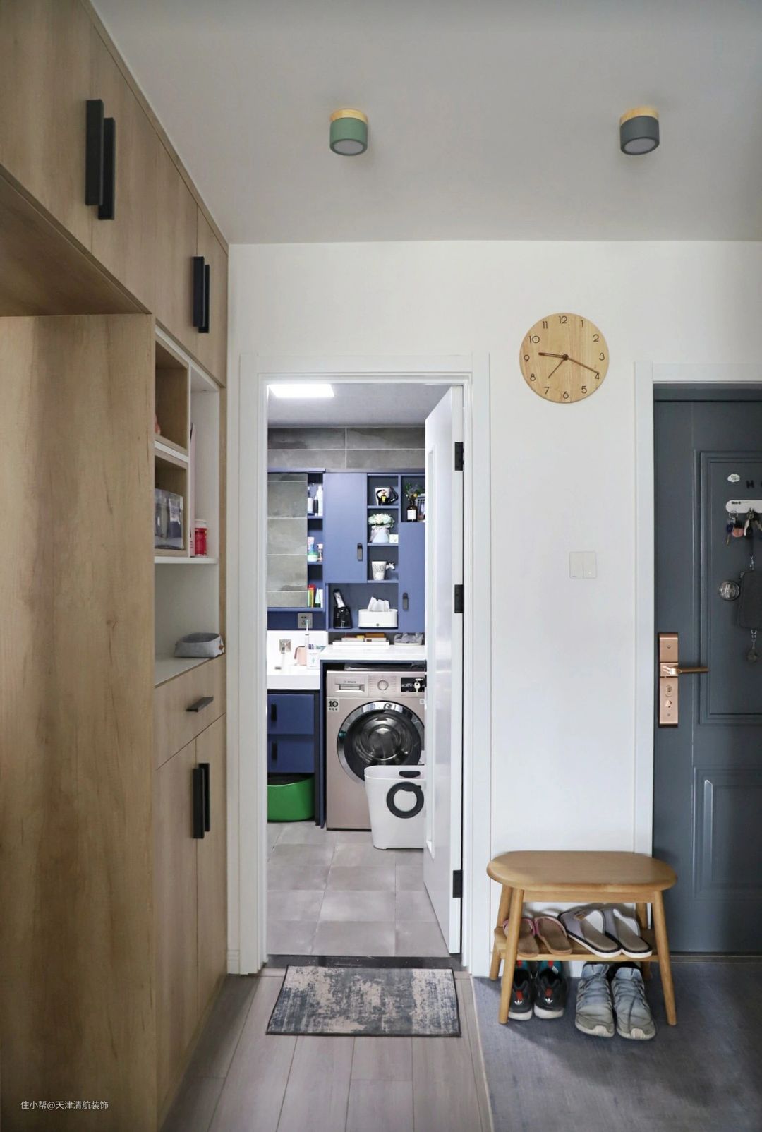 旁边放着一张小小原木换鞋凳,底下可以方便收纳几双常穿的鞋子,坐着换穿鞋子的时候,方便很多。
