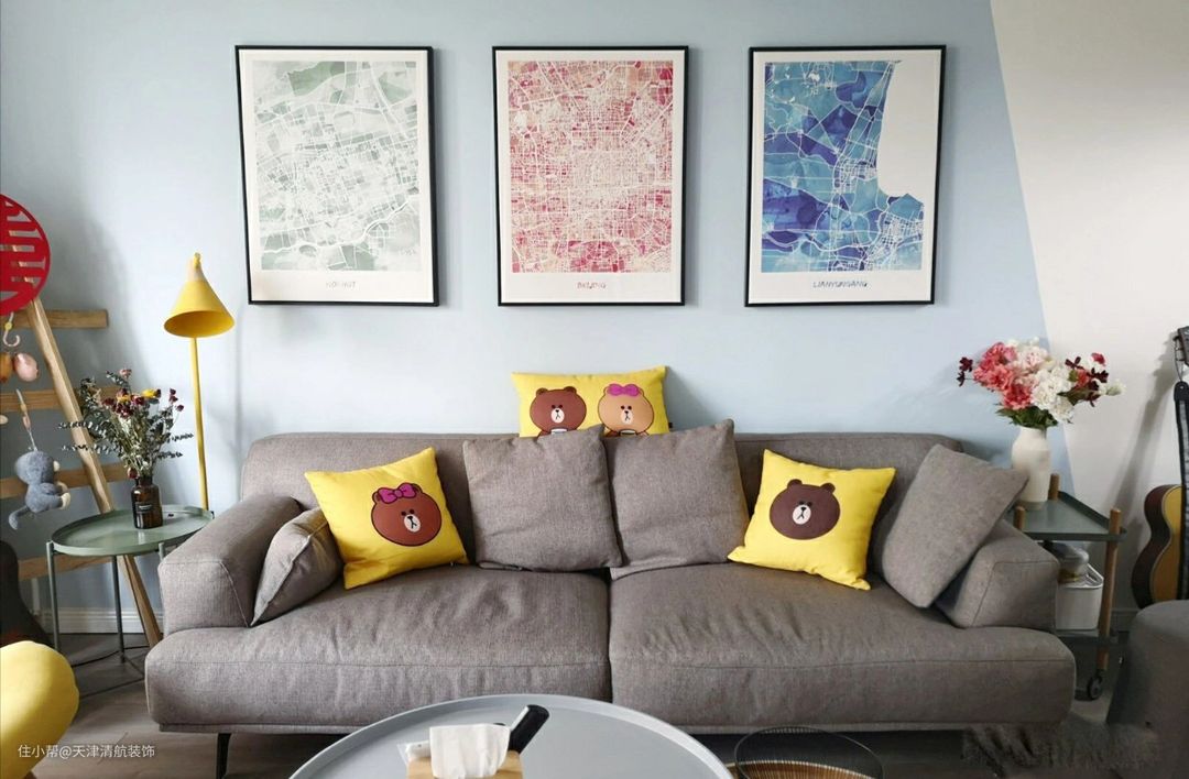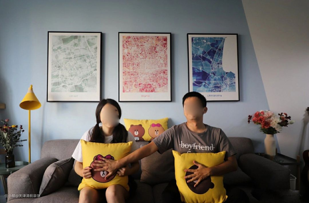 布置了双人灰色布艺沙发,坐着特别舒服,搭配着黄色的抱枕,灰色与黄色刚好完美搭配。室内所有搭配,包括家具都是他们夫妻一起努力做好,尽量能搭配出想要的效果。空间不大,双人沙发足够了。