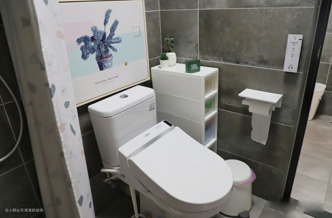 用浴帘做干湿分离,更灵活使用。空间比较小,直接安装玻璃作为隔断,不合适,浴帘的话,显得空间没那么拥挤。安装了马桶,旁边还有一个储物柜,非常实用。
