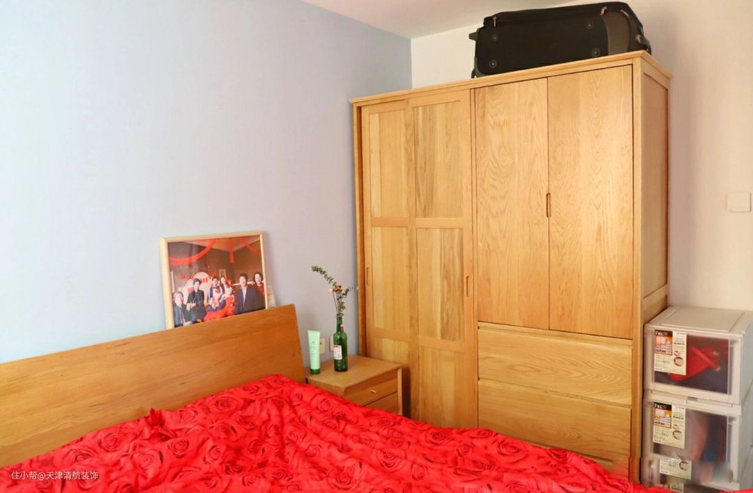 次卧更极简,考虑到以后是作为小孩房,衣柜直接买现成的,以后需要换的时候,方便很多。床头背靠上放着父母双方合影,太幸福了。卧室主要是休息的空间,没有做其他的造型,更没有安装吊顶。