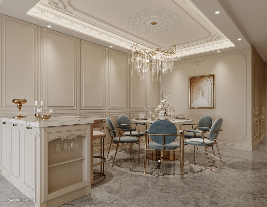 纯色,简洁的配色,总会让人能放下手机,与家人一起安静的享受美食。现代轻奢、意式轻奢、法式轻奢是现在颇受年轻人青睐,大理石桌面+金属感座椅,时尚摩登又不是家庭温度,轻松搭配出轻奢小资韵味,在这样的环境里用餐,心情也会美美哒~