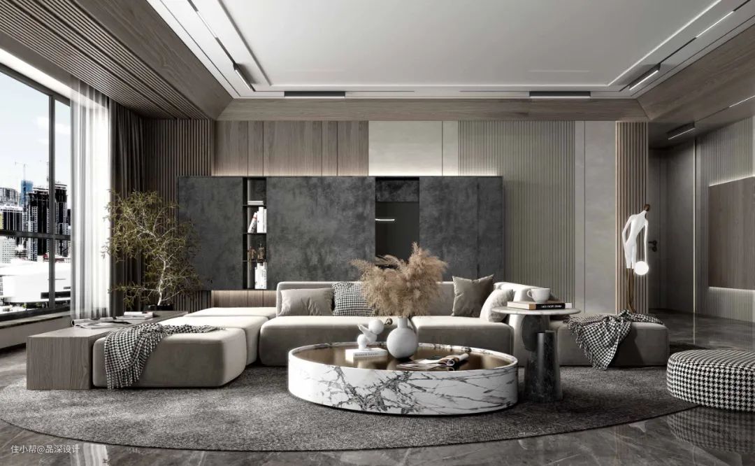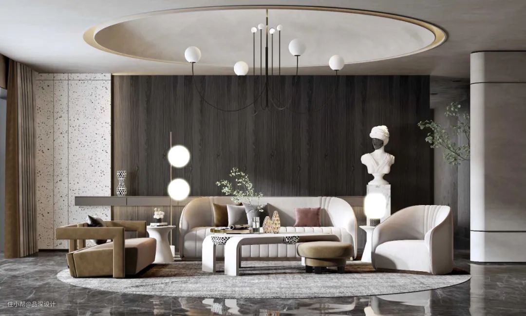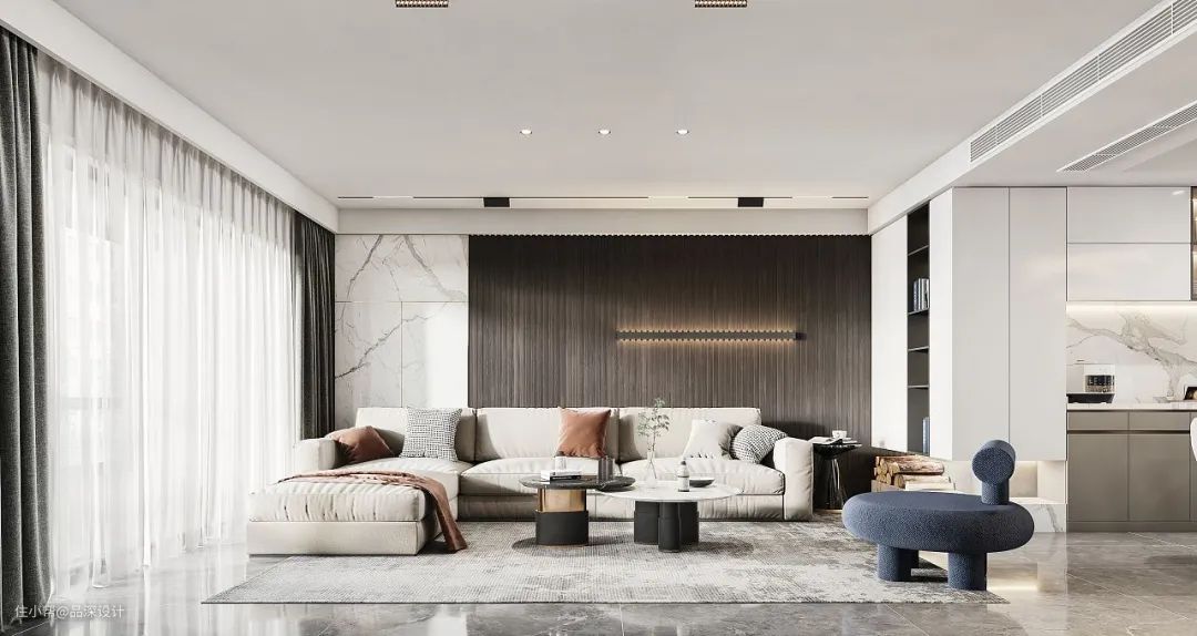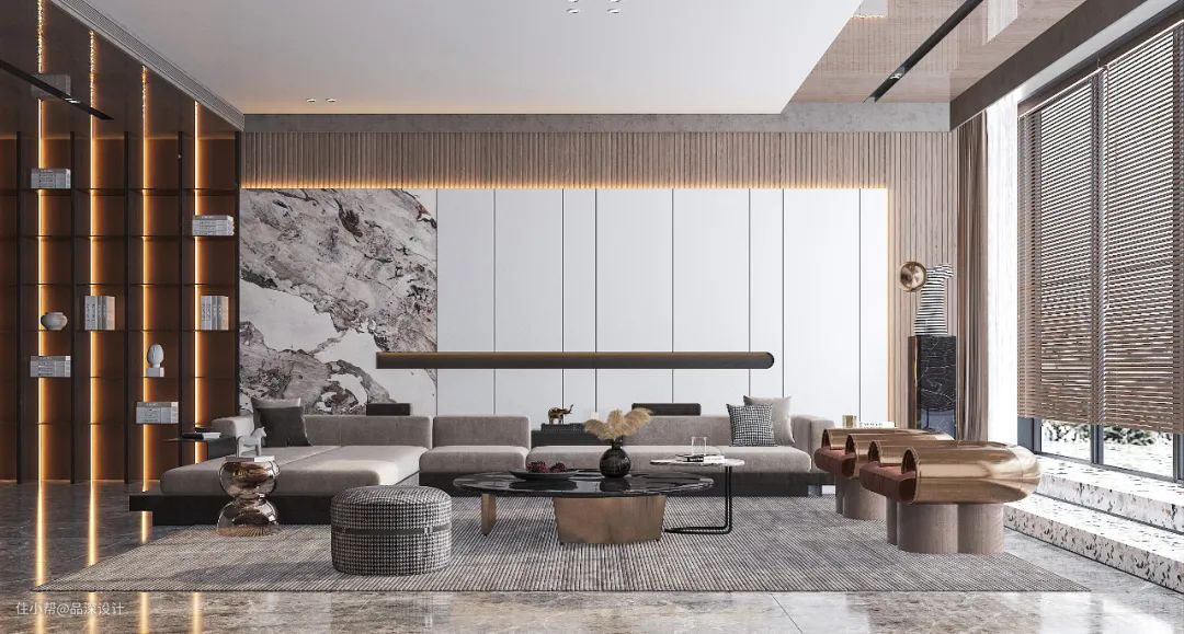 大理石呈现的是一种奢华大气的空间质感,或粗犷,或细腻的纹理都带着自然的野性,是一种简约而不简单的美。大理石在室内被广泛应用,常与木饰面、岩板、灯带等相互搭配。