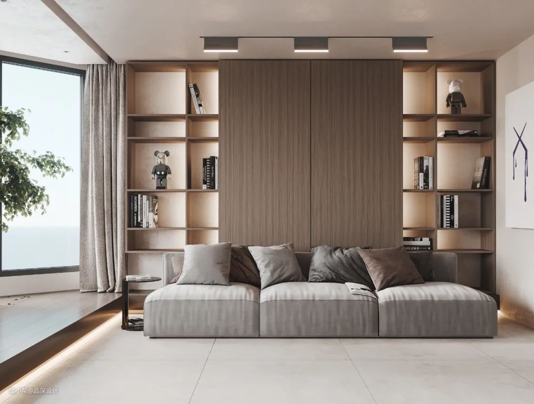 定制柜体背景墙可以根据整体的设计风格选择定制的造型及饰面板的样式,极简风格下可以选择无拉手平面造型,欧美风格可以选择带框线的门板造型,可以搭配相应的镂空隔板,玻璃门等,也是沙发背景墙设计中非常好的选择。