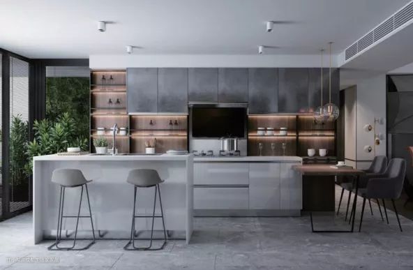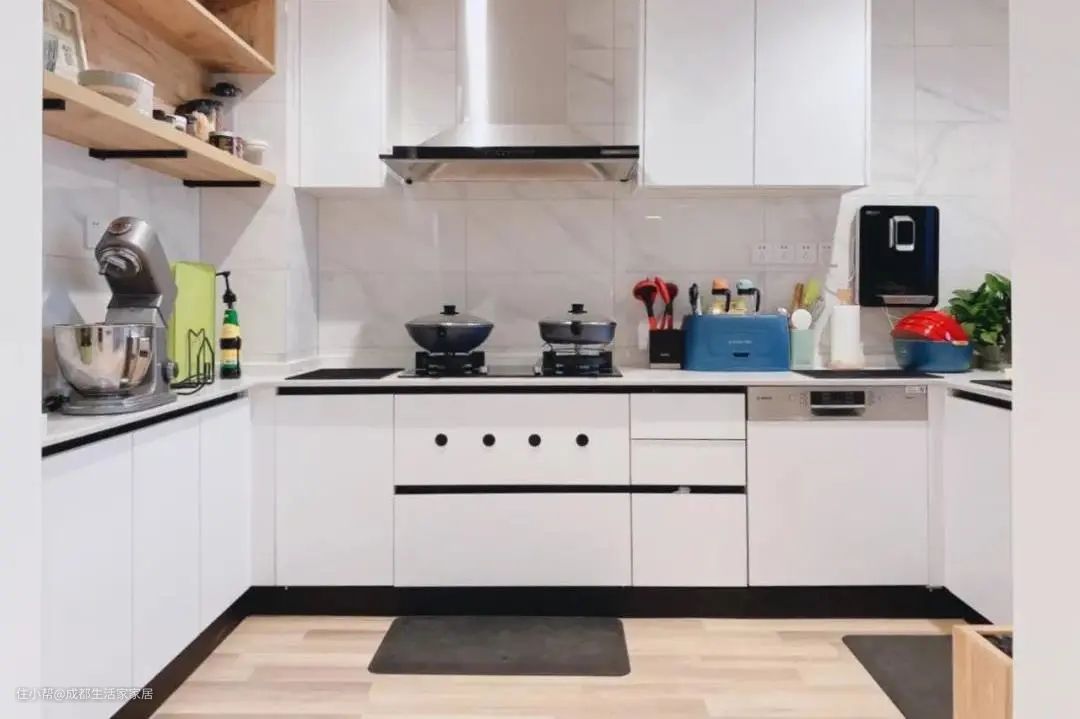 橱柜选择,首先考虑防火,防水,防潮,使用寿命才能更长;为保证储物功能,最好「吊柜+地柜」搭配。