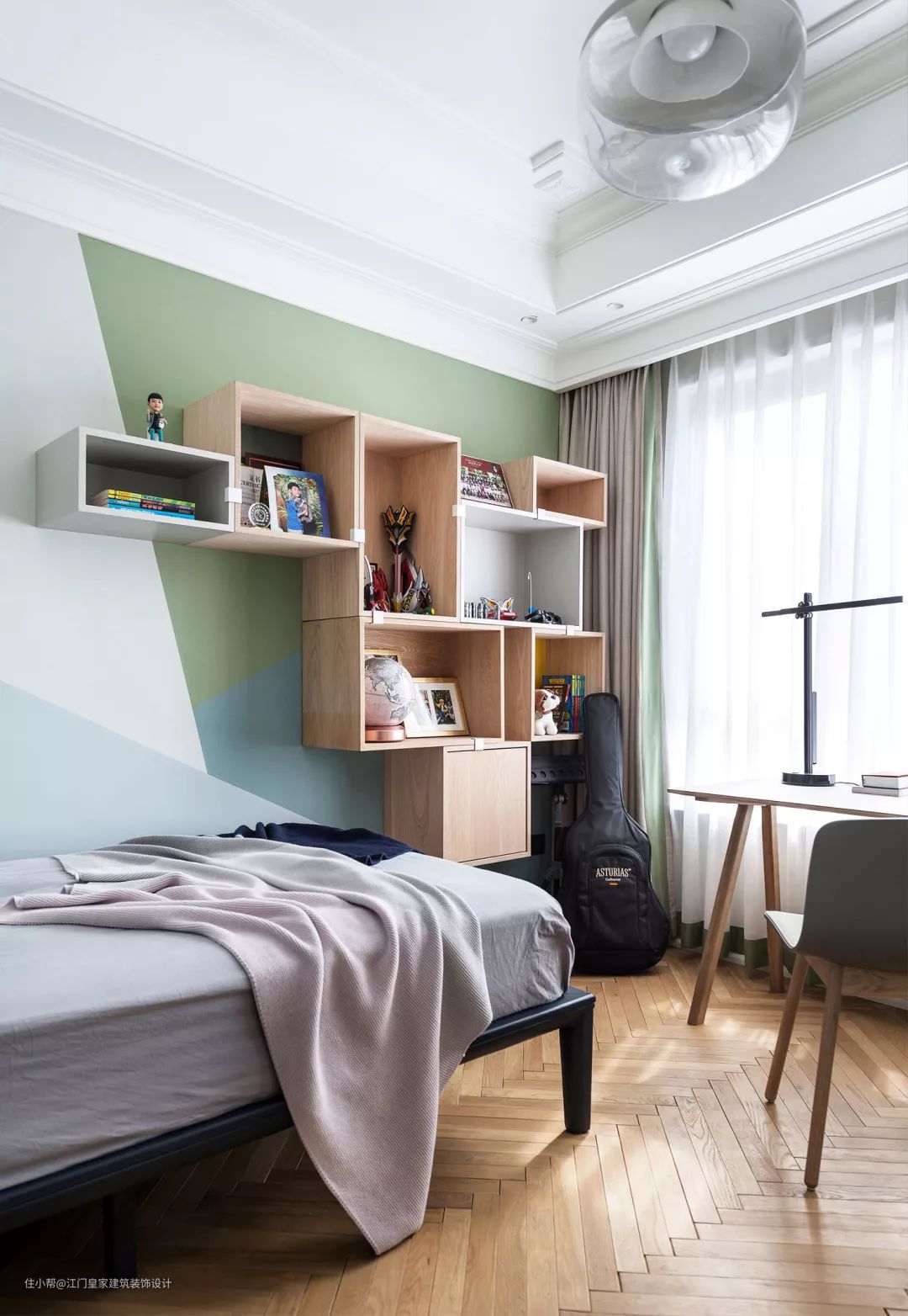 ▲儿童房拼色乳胶漆墙面,墙面的木质收纳书架,为空间带来了一种灵活多样的储物与展示位置。