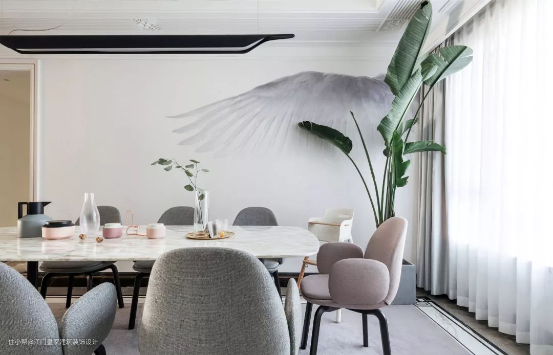 ▲餐厅背景墙大面积的留白从窗户边展开一个墨色飞翅,角落还有一盆芭蕉叶绿植,搭配上轻奢简约风的餐桌椅布置,带来的是一种简洁的端庄气息。