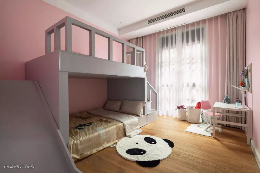 上下床若是可以加点小心思,可以结合上游乐玩耍的功能进去,让儿童房成为孩子在家玩耍的好地方。