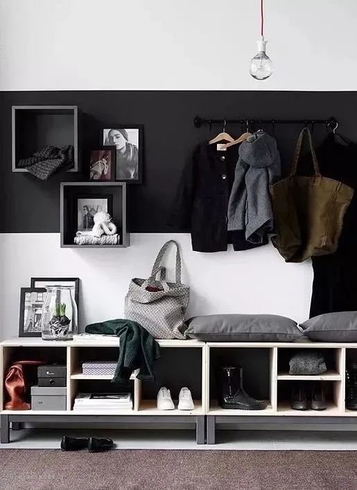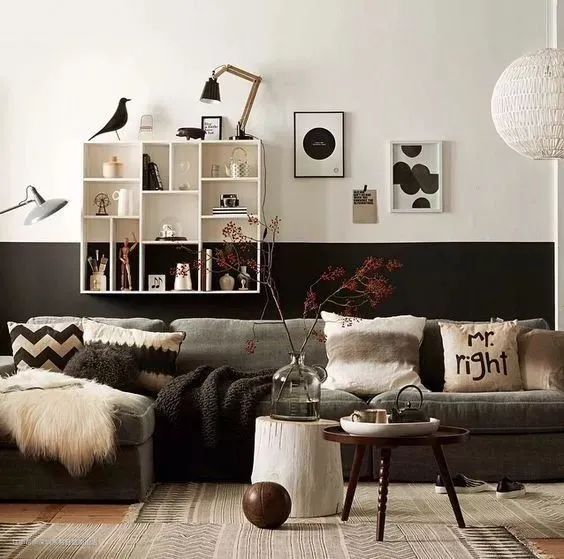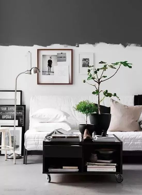 特别酷的黑白相间墙壁,艺术感十足。刷上半面低调的灰色,用些植物点缀,也能让家看起来更有品位。