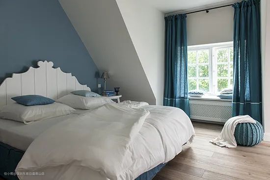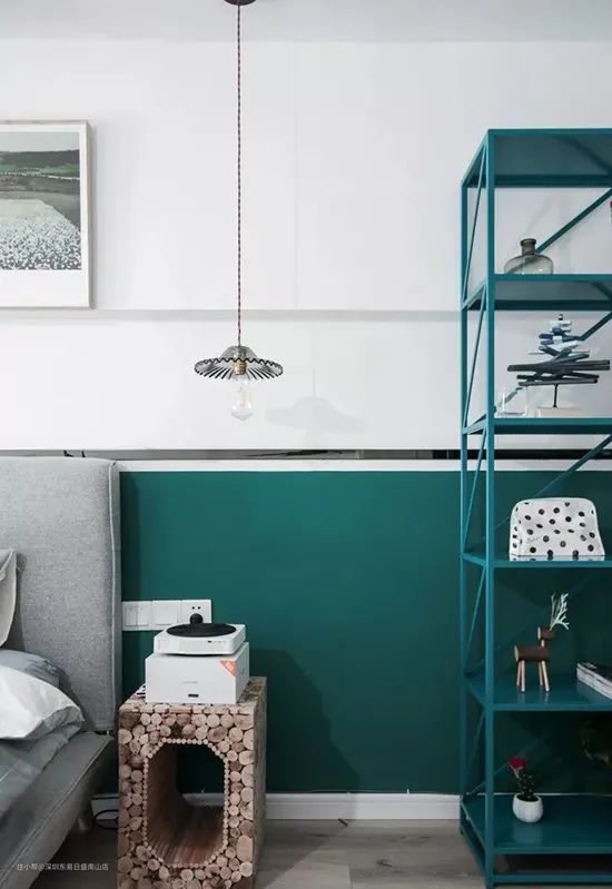 白色跟酞菁绿搭配出来的拼接墙色,形成了鲜明的小反差,但结果是同样赏心悦目,还时尚。