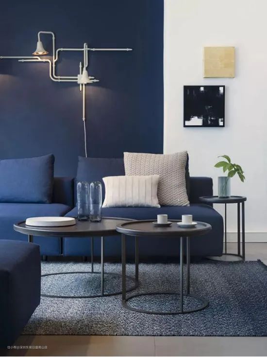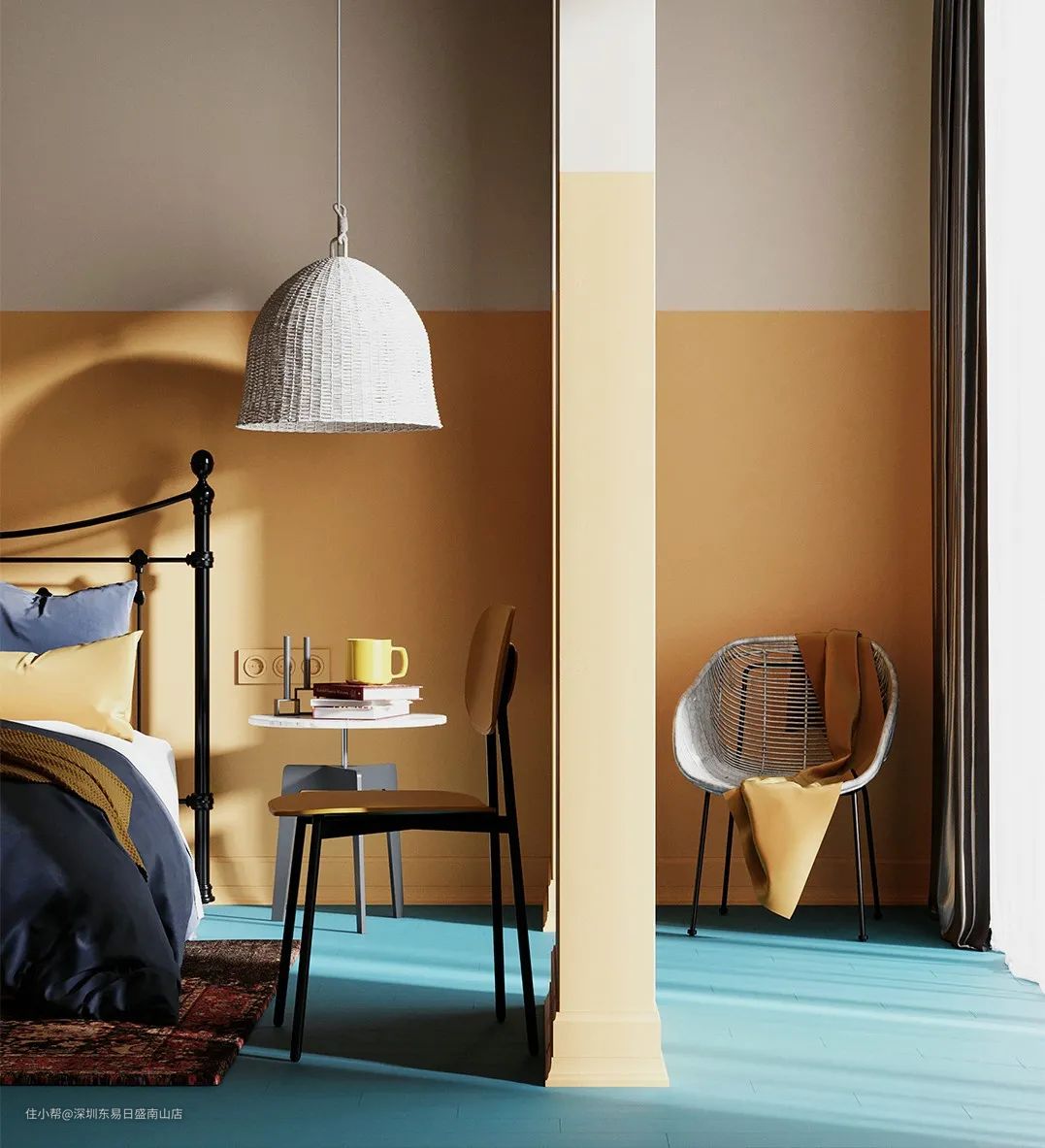 蓝色的墙面给人安宁感,但饱和度高的蓝或黄,看久了容易让人视觉疲劳。而半面蓝色、半面复古黄色的墙壁,既让家有了高级感,又经久耐看。