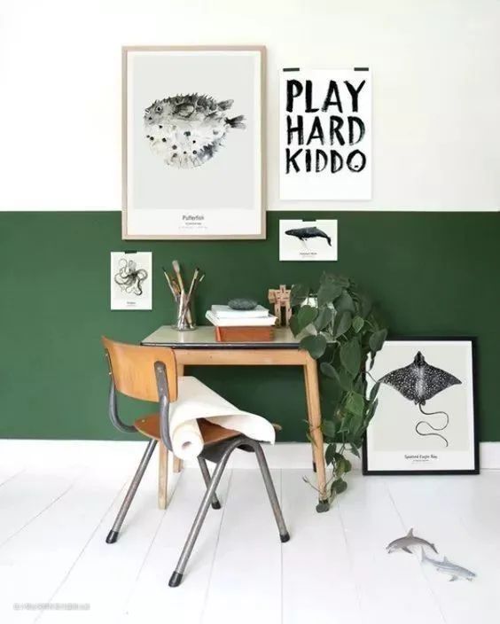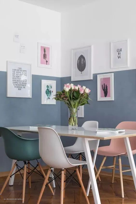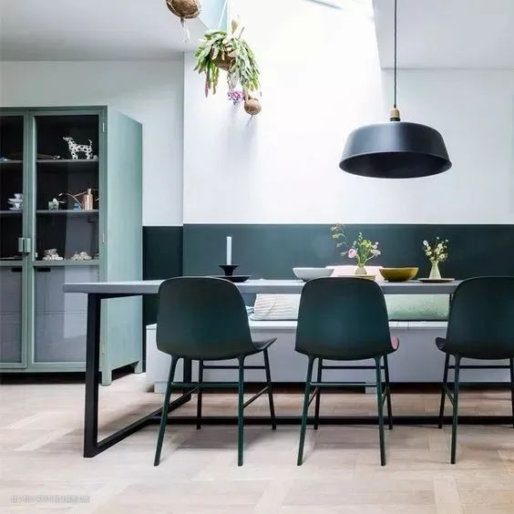 半墙颜色的选择很重要,可以避免墙体沾上总东西不止影响到整个空间。而且在室内采光不足的情况下,色彩还可以起到提升空间明亮度的作用。