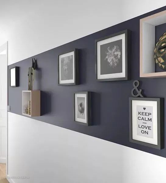 我们还可将墙面颜色的分布位置加以调整、利用,譬如像上面这样。让其中一部分墙成为画框背景,艺术画有了墙面背景的衬托,是不是更加有个性了?!