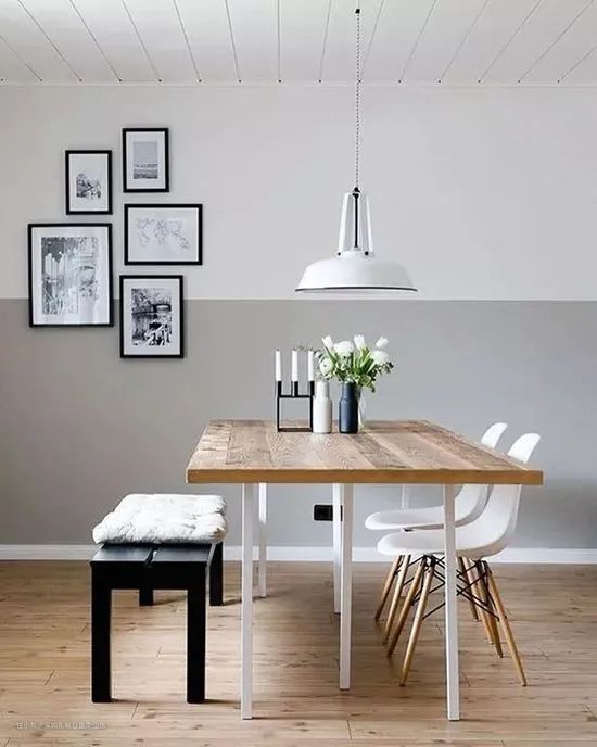 一般,上下双拼样式里上半部分以白色为多,白墙对整体家居风格的包容性会更强,很容易给人干净、明亮的视觉效果。最重要的是,下半部分搭什么色都可以,也很容易实现,又解决了纯色墙面过于普通和乏味的问题。