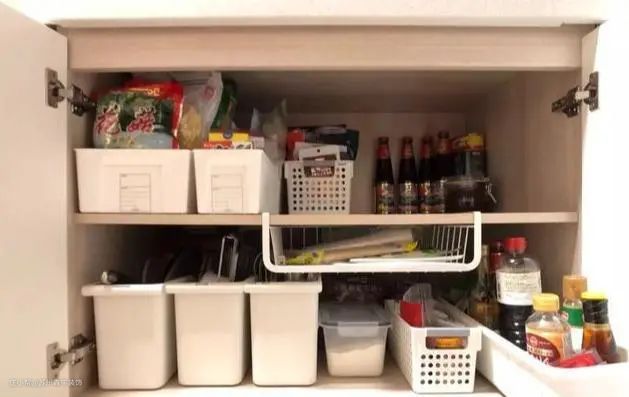 对于橱柜中的吊柜来说,由于柜子内部的上方位置因高度的原因,往往是比较鸡肋的空间,不能做到充分的利用。因此,吊柜上层适宜放“量轻”的物品,同时又考虑到收纳和使用的方便性,将这个物品“化零为整”地装入收纳盒中,就是最好的选择。