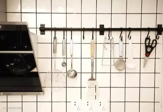 厨房台面上方的墙面位置,如果说只是任由浪费,那就是太可惜了,所以在充分利用好这个空间,这样能台面上面50%的杂乱。此进就可以在墙面上使用横杆+S钩的组合,能将原来放在台面上的小物品全部往墙上收纳,使用得台面瞬间变得整洁,这样下厨时动线更高效。