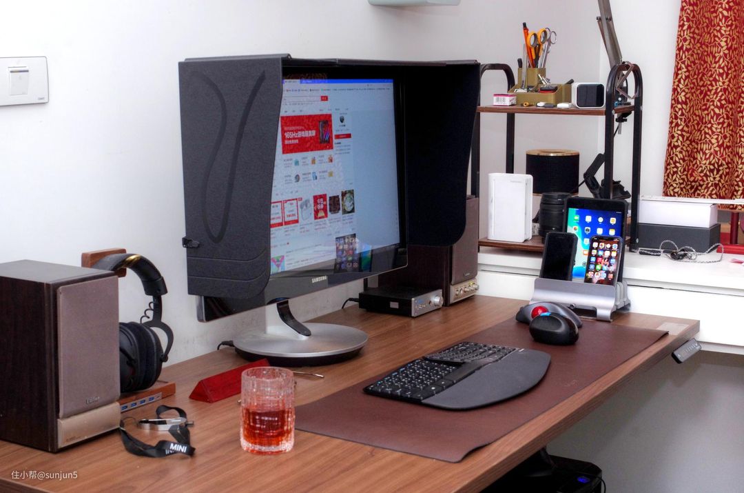 我选的是140*70cm的型号,桌面真的比我之前的桌子大了不少,键盘+鼠标+轨迹球的的配置用起来空间非常宽裕,一点都不局促。27英寸的显示器两侧还能轻松摆放音箱和耳机、耳放等物品,大桌面用起来就是痛快。
