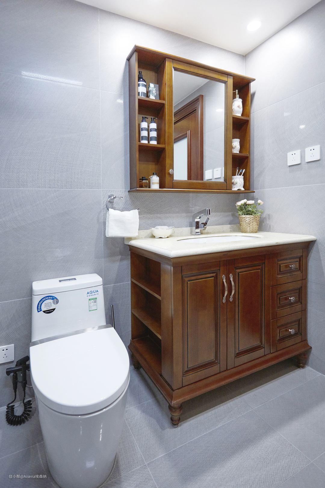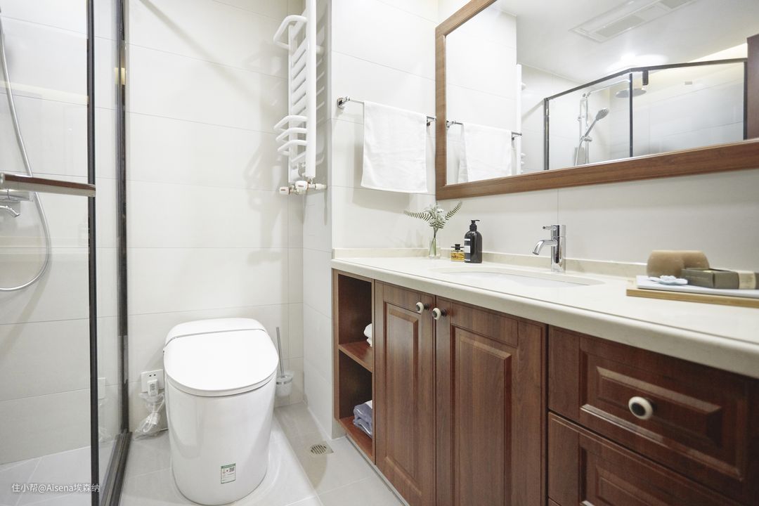▼接下来看看大气美观的中式风格的浴室木作:浴室柜与墙体完全贴合,喜仕隆石英石台面,樱桃木纹吸塑板材质,柜体设置了若干区域,方便放置不同体积的物品,尤其是左侧因有马桶挡住故做成了开放格,方便收纳。