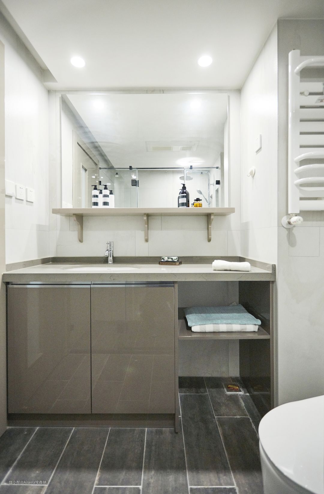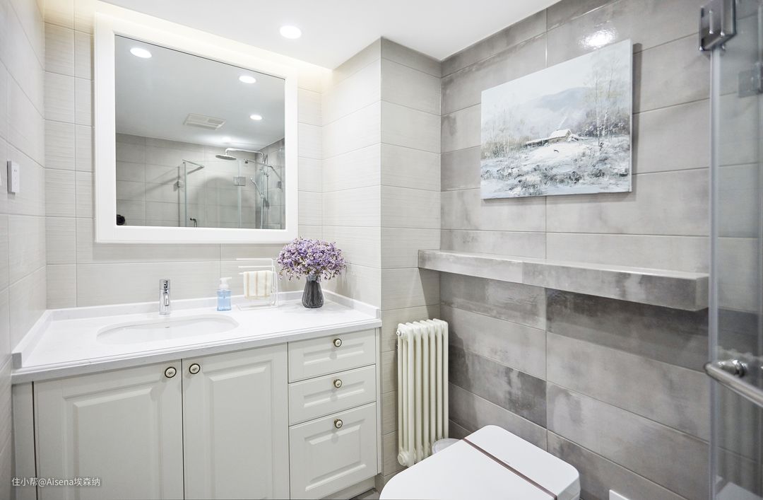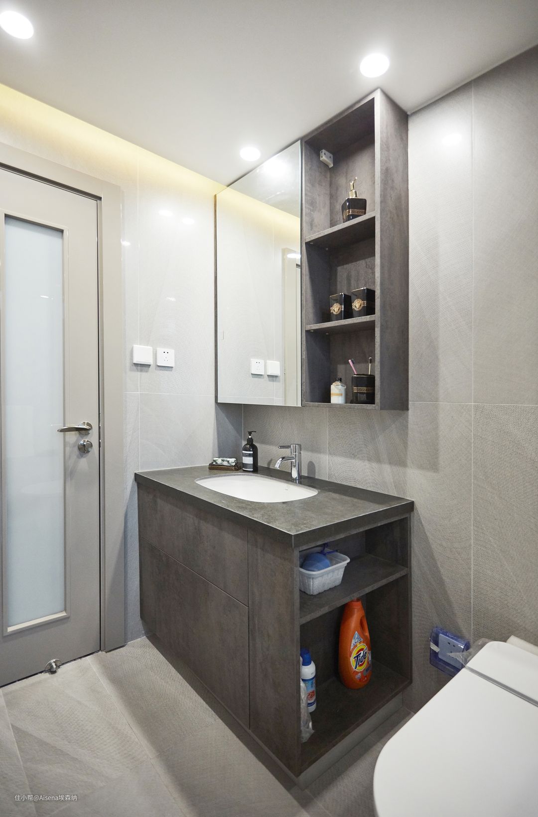 ▼现代简约风格方面,浴室柜也可以做得高大上:主卫的柜体采用浅灰色亮光烤漆板+石英石台面的组合,次卫的柜体是F★★★★“伯纳尔石纹”+“玛莎灰”岩板,这两种组合带来强烈的现代气息,令人着迷。当然,解决“如厕难题”的开放格还是安排上了。
