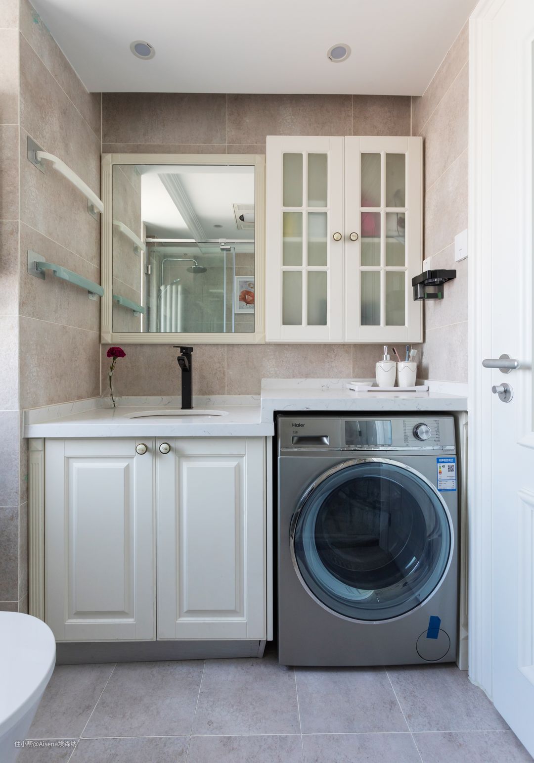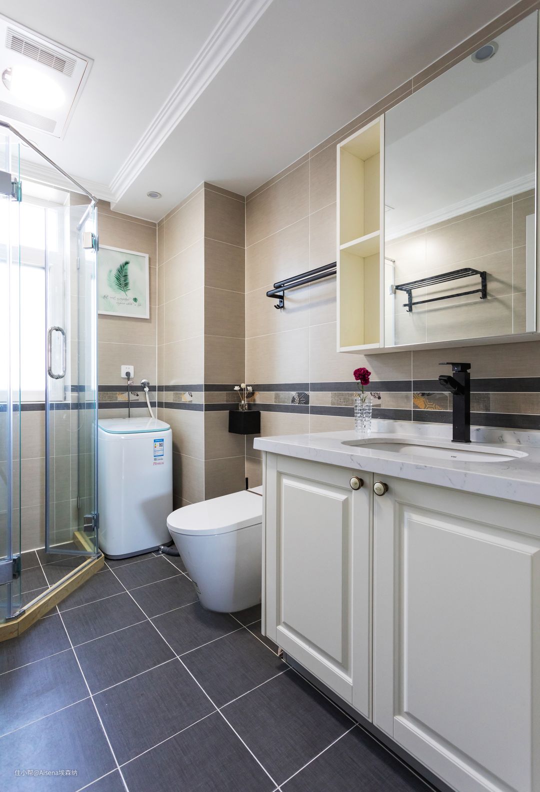 ▼根据狭长的卫生间构造,这个案例的主卫和次卫使用了与整体风格相配的“香草天空”吸塑浴室柜和吊柜/镜柜。浴室柜的区域可以放下洗衣机,不占用宝贵的浴室面积,方便放取衣物的同时减少了积水的侵扰。
