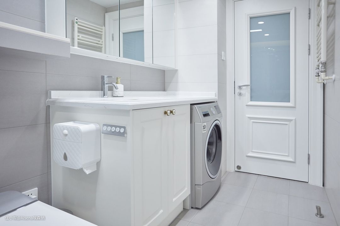 次卫明亮的镜柜下,我们设计了利于高个子的客户使用的石英石台面烤漆浴室柜,洗衣机可以放进预留的空间,浴室柜一旁装有卫生纸和智能马桶操作面板方便如厕。