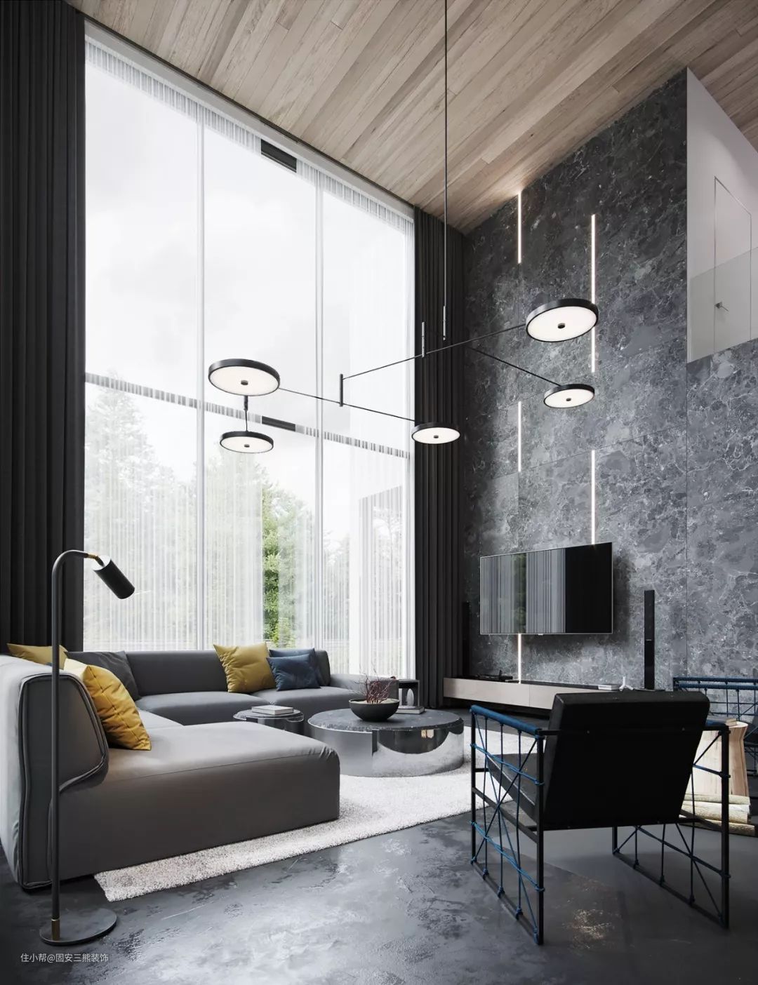 挑高的设计,落地窗的加入,让空间更加通透明亮的同时,搭配木质的吊顶和黑色的吊灯,更显宁静和质感。
