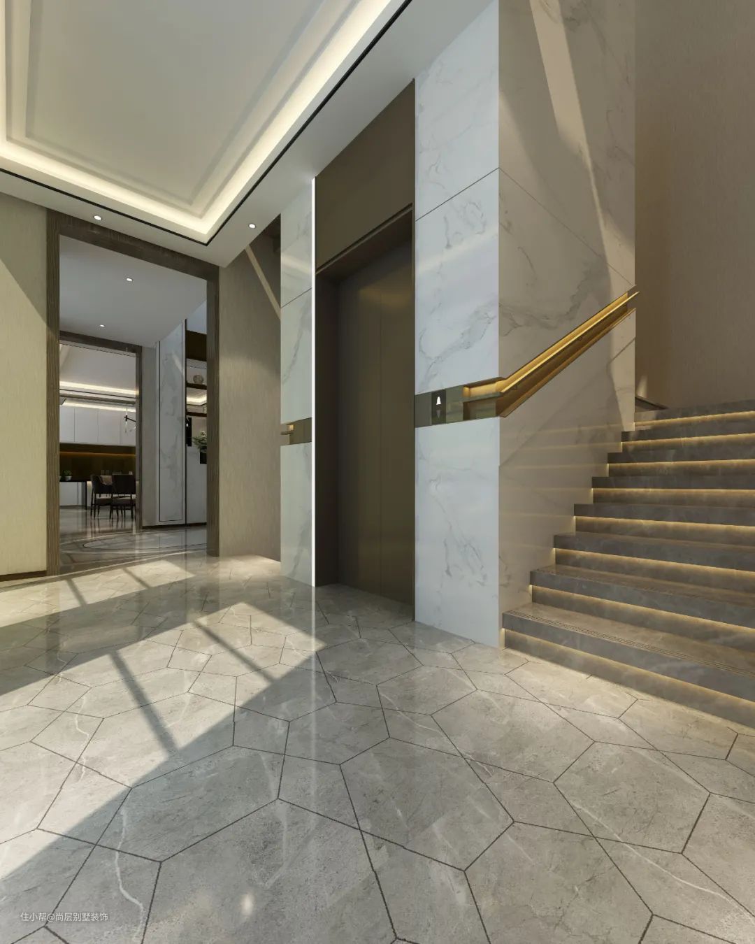 步入一层是挑空设计的玄关,空间以高级灰为主基调,烘托出和谐而宁静的氛围,再以不同纹理、色彩及材质划分出客厅、餐厅及西厨,将东方艺术所涵蕴的独特韵味从色调的深浅中呈现出来。