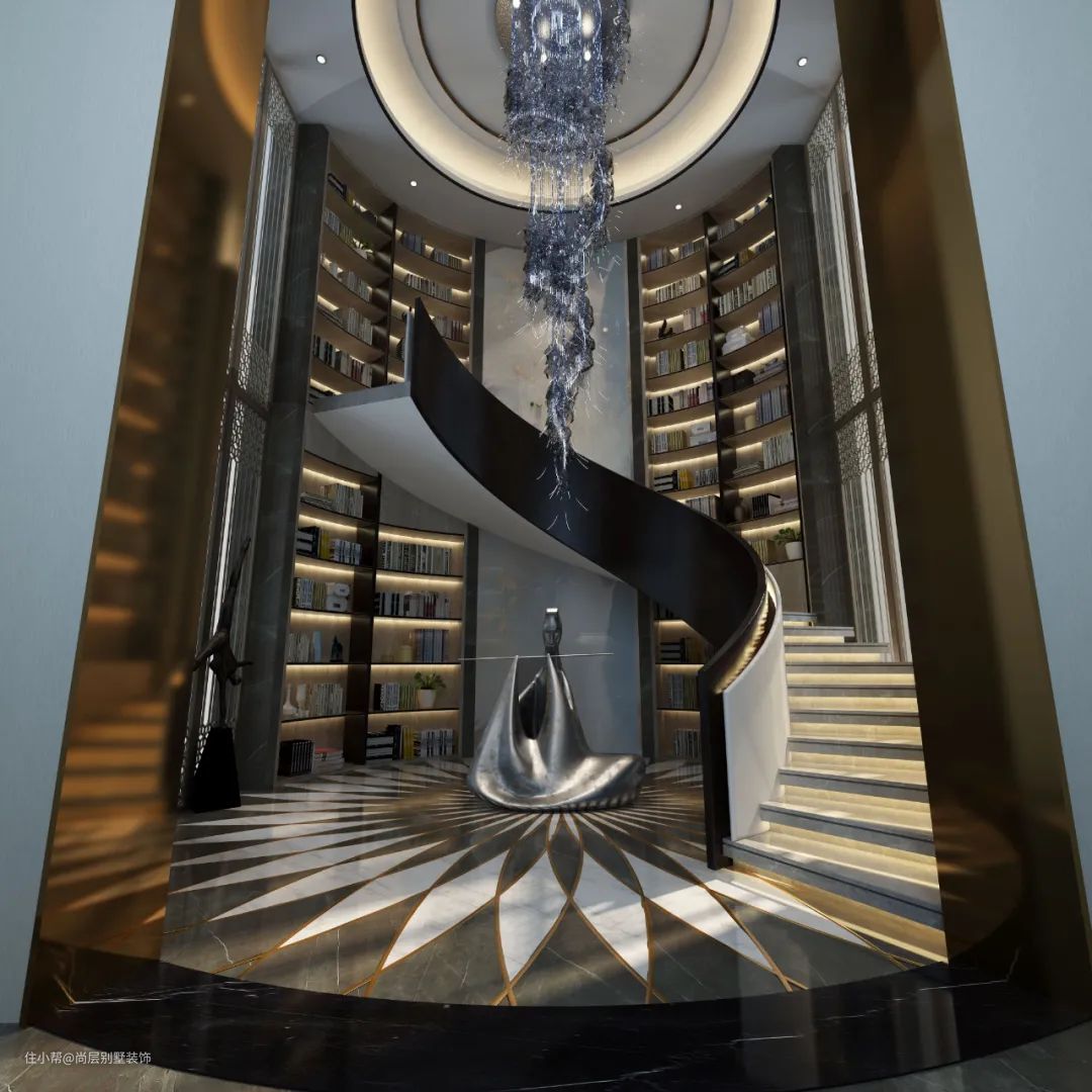 地下室一层为阅读区,书柜成柱面结构环抱着楼梯,楼梯呈旋转型,身临其中,仿佛被书香气息紧紧环绕。 这一做法新颖而大胆,不仅使空间关系更加灵动,也打破地下入户的沉闷感,让空间更有“性格”可言。整个阅读区,它的线条感和灯光表达类似于藏书阁的概念,其手法处理简洁,但细节比例和空间关系需关联好,以便在分隔与组合之间可以巧妙切换。