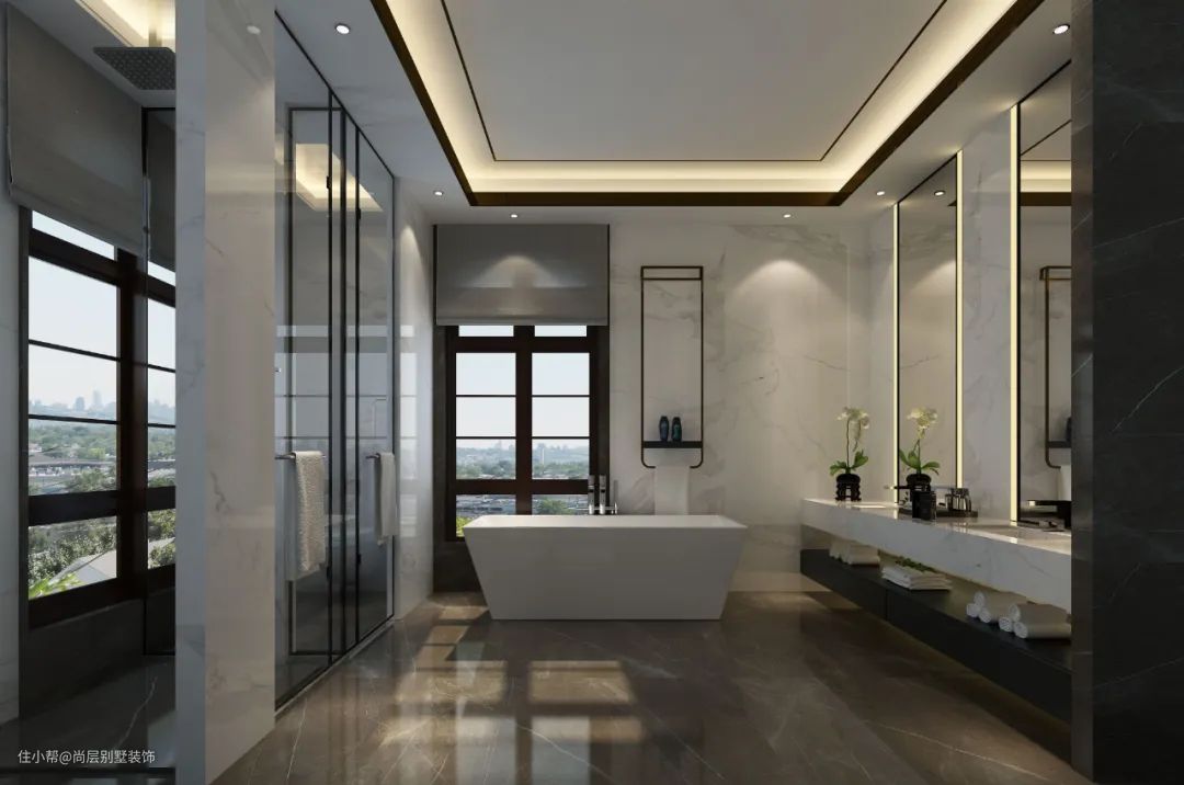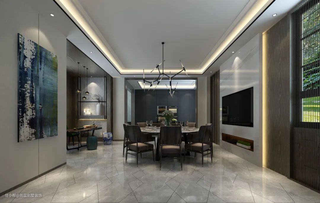 客厅运用白色石材搭配厚重的沙发,可谓典雅庄重,铜制的茶几又彰显细节的精致;而整体大气简洁的气质,再现了中式格调的儒雅与极简的时尚感。