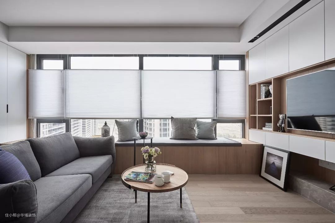 如果是客厅本身没飘窗的话,若是空间足够大,也可以通过定制设计来增加飘窗坐席,而且这个飘窗还能兼备上收纳功能,也是一种巧妙而又实用的设计方案。坐席储物两不误。