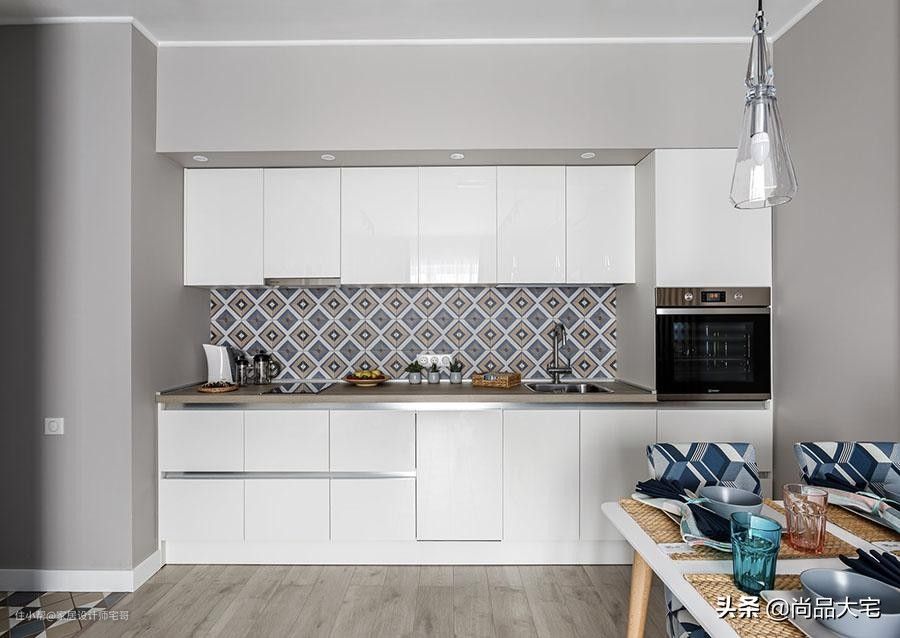 开放式厨房一字型布局,旁边设计了一组电器柜,嵌入了一台全尺寸的烤箱。通体白色的橱柜和吊柜给人一种干净整洁的视觉感,还可以反射光线,让空间显得更加宽敞通透。厨房后挡板铺贴了带花纹的墙砖,既能美化墙面,方便清洁,又能增加空间层次感,避免单调。吊柜上方的吊顶造型中安装了一排筒灯,吊柜下方安装了灯带,可以为厨房提供充足的光线。