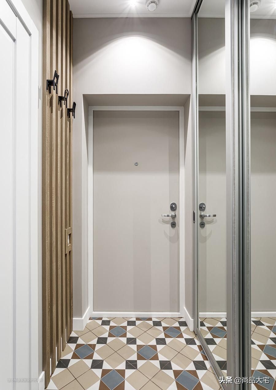 1.入户玄关两侧分别设计挂衣区和带镜面柜门的通顶大衣柜,解决进门收纳需求。