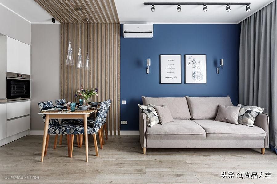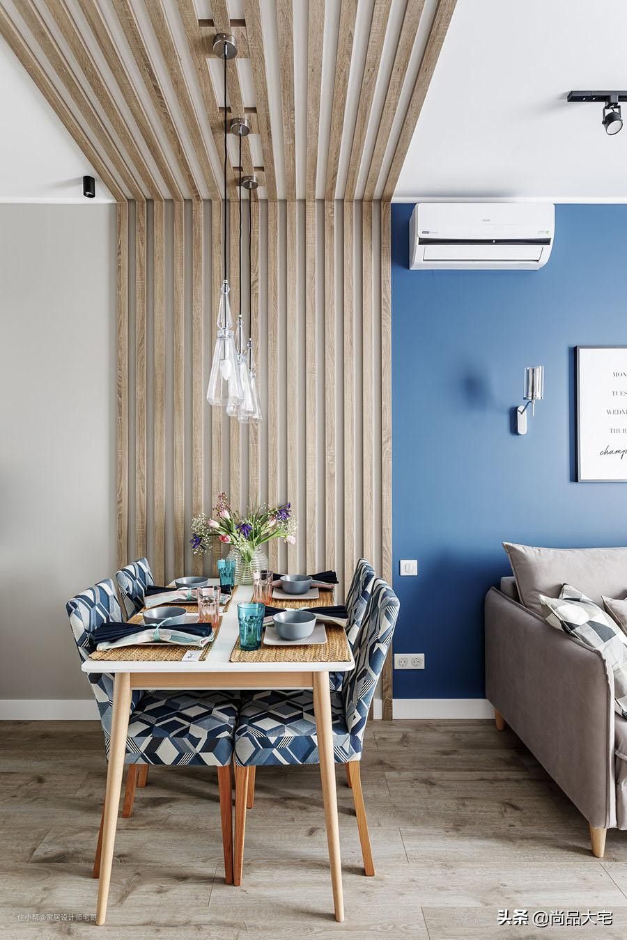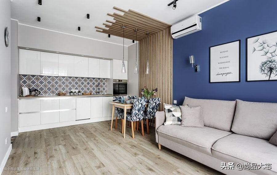 4.厨房、餐厅、客厅一体化设计,通过不同的背景墙面颜色和时尚的板条来进行视觉上的分区。