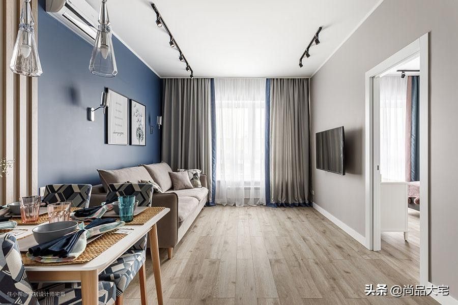餐厅旁边规划的是客厅区域,沙发背景墙刷了一层蓝色的面漆,搭配温馨柔和的米色沙发,给人一种清爽大气的视觉感,同时也是通过不同的色彩来做到视觉上的功能分区。沙发背景墙上安装了一台壁挂式空调,下方对称设计了两盏壁灯和两幅装饰画,既美观又实用。