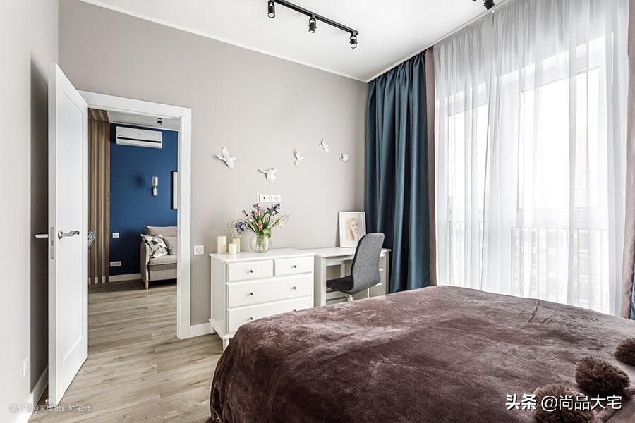 卧室内安装了多层窗帘,可以有效地隔绝光线,保证睡眠质量。卧室白色的窗帘外面是一个休闲阳台,是一个放松休闲的好去处。