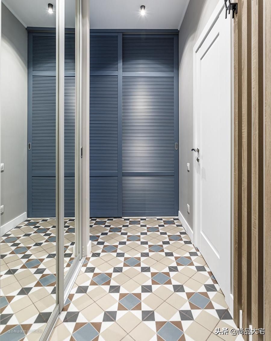 正对入户门一侧设计了一组嵌入式的收纳柜,柜门为蓝色的百叶窗设计,里面包含了摆放吸尘器等清洁用品以及带有熨衣板的收纳架,主要用来收纳家里的一些杂物。靠近厨房一侧还摆放了一台冰箱,方便做饭的时候使用。熨衣板放在这里,从卫生间内的洗衣机洗好的衣物可以在这里熨平后分类收纳到玄关和卧室的衣柜中,使用起来相当方便。