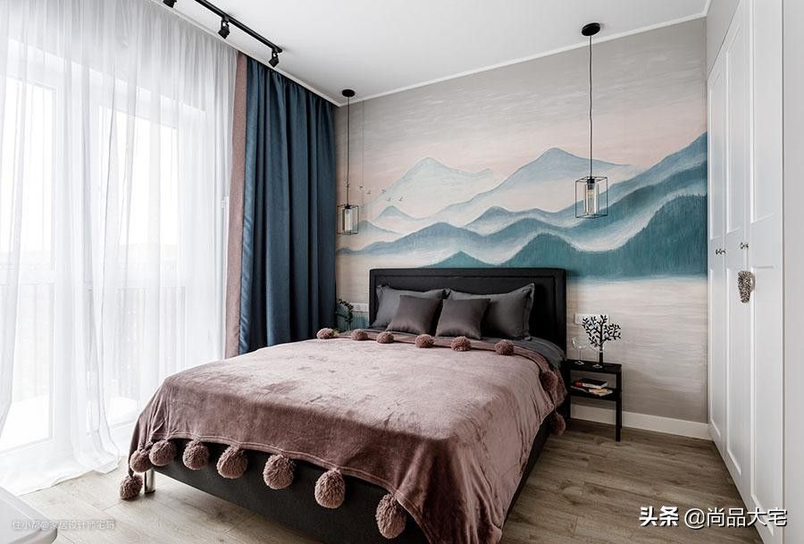卧室内摆放了一张舒适的双人床,黑色的床体稳重大气,暗红色的床上用品给家居增添了温馨的氛围。床头背景墙的风景画增加了视野的开阔性,美观又大气。