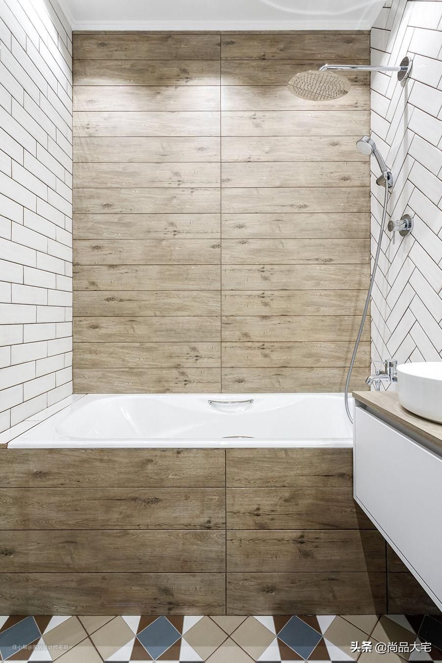 浴缸外侧和内侧都铺贴了仿木纹的墙砖,给整体白色的卫生间空间增添了温馨的感觉。浴缸旁边留出了空间设计摆放洗浴用品的台面,方便洗澡时拿取。