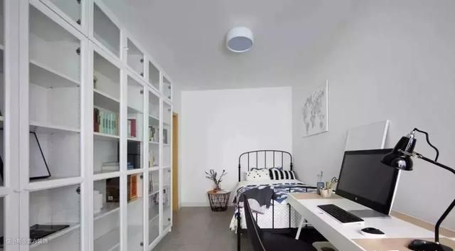 书桌摆放在床尾,另一侧是超大的书柜,整个空间的采光非常好。