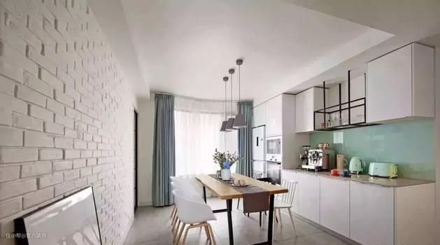 餐厅背景墙的文化砖设计是一大亮点,另一侧则设计成西厨,浅绿色的墙面将原本单调的白色空间变得更加丰富多样,冰箱与其他厨房电器完美的嵌入其中。