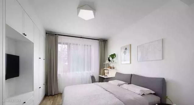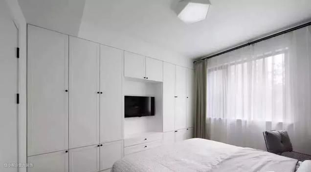 床尾设计了一整面墙的收纳柜,中部留空悬挂一台小电视,储物功能特别强。